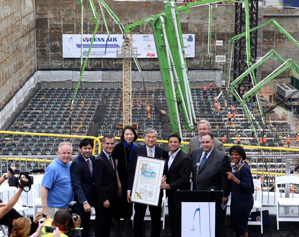 ÇÑÁø±×·ìÀº 15ÀÏ(Åä) LA Àª¼Å°¡¿Í Çǰܷξư¡ »çÀÌ¿¡ À§Ä¡ÇÑ Àª¼Å ±×·£µå È£ÅÚ(The Wilshire Grand Hotel) ÇÁ·ÎÁ§Æ® ÇöÀå¿¡¼ Àª¼Å ±×·£µå È£ÅÚ °Ç¹° ±¸Á¶¹° °ø»ç¿¡ º»°Ý Âø¼öÇÏ´Â ÄÜÅ©¸®Æ® Ÿ¼³ ±â³äÇà»ç¸¦ °¡Á³´Ù.