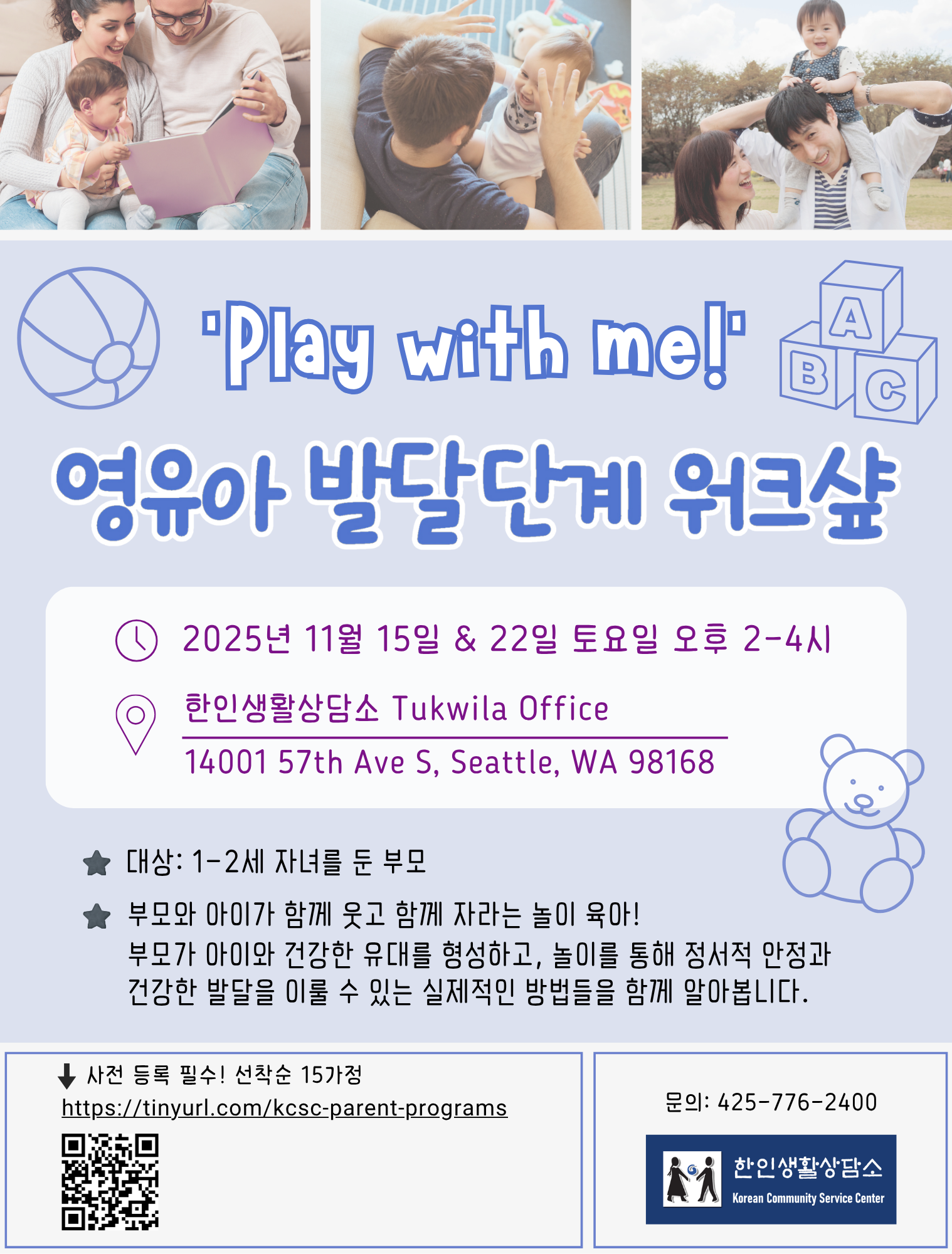 ÇÑÀλýȰ»ó´ã¼Ò(KCSC, ¼ÒÀå ±èÁÖ¹Ì)°¡ 1¼¼¿¡¼ 2¼¼ »çÀÌÀÇ Àڳฦ µÐ ºÎ¸ð¿Í Á¶ºÎ¸ð¸¦ ´ë»óÀ¸·Î 11¿ù ¿öÅ©¼ó ½Ã¸®Á ¿¬´Ù. À̹ø ¿öÅ©¼óÀº ºü¸£°Ô ¹ß´ÞÇÏ´Â ¿µÀ¯¾Æ ½Ã±âÀÇ Æ¯¼ºÀ» ÀÌÇØÇϰí, ¾ÆÀÌÀÇ ½ÅÈ£¸¦ ÀÐ°í ¹ÝÀÀÇÏ´Â ¹æ¹ýÀ» ¹è¿ì´Â µ¥ ÃÊÁ¡À» ¸ÂÃá´Ù.