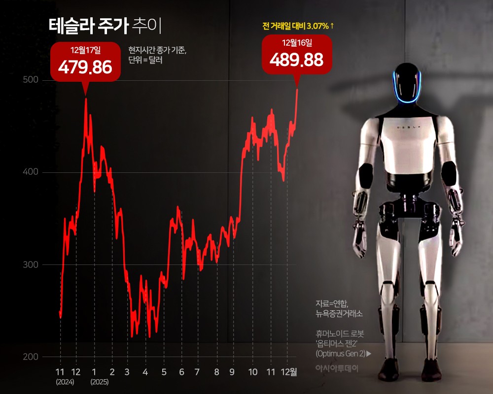 16ÀÏ ´º¿åÁõ½Ã¿¡¼ Å×½½¶ó´Â Àü °Å·¡ÀϺ¸´Ù 3.07% ¿À¸¥ 489.88´Þ·¯¿¡ °Å·¡¸¦ ¸¶ÃÆ´Ù. Àå ¸¶°¨ Á÷Àü¿¡´Â 491.50´Þ·¯±îÁö Ä¡¼ÚÀ¸¸ç 52ÁÖ ½Å°í°¡¸¦ »õ·Î ½è´Ù. ÀÌ´Â Áö³ÇØ 12¿ù 17ÀÏ ±â·ÏÇÑ Á¾°¡ 479.86´Þ·¯¸¦ ¾à 1³â ¸¸¿¡ ³Ñ¾î¼± °ÍÀÌ´Ù.