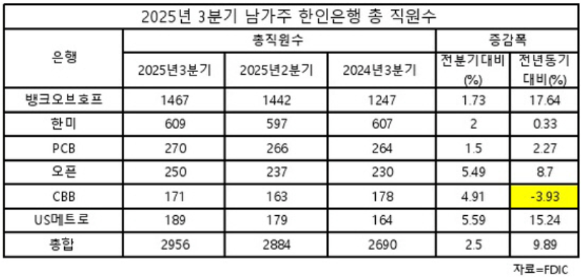 ¿¬¹æ¿¹±Ýº¸Çè°ø»ç(FDIC)ÀÇ ÃÖ±Ù ÀڷḦ Áý°èÇÑ °á°ú ¿ÃÇØ 2ºÐ±â ±âÁØ ³²°¡ÁÖ ¼ÒÀç 6°³ ÇÑÀÎÀºÇàÀÇ ÃÑ Á÷¿ø¼ö(Á¤Á÷¿ø ±âÁØ)´Â 2956¸íÀ¸·Î Á÷ÀüºÐ±â(2884¸í)´ëºñ 2.5%, Àü³âµ¿±â (2690¸í) ´ëºñ 9.89% Áõ°¡Çß´Ù.ºÒȲ ¼Ó¿¡¼µµ Ÿ Áö¿ª ¿µ¾÷¸ÁÀ» È®´ëÇÏ¸é¼ Á÷¿øÀÌ Áõ°¡ÇÑ °ÍÀ¸·Î Ç®À̵ȴÙ.