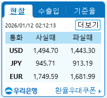 À̳¯ ¿ì¸®ÀºÇà °í½Ã ȯÀ² ±âÁØÀ¸·Î ´Þ·¯ ÇöÂû ¸ÅÀÔ È¯À²Àº 1,494.70¿øÀ» ±â·ÏÇØ ÀüÀÏ ´ëºñ Å« ÆøÀ¸·Î ¿Ã¶ú´Ù. ÇöÂû ¸Åµµ ±âÁØÀ¸·Î´Â 1,500¿ø¼± µ¹ÆÄ °¡´É¼ºµµ °Å·ÐµÈ´Ù.