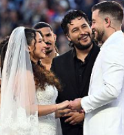 ¾à 13ºÐ°£ ÁøÇàµÈ ÇÏÇÁŸÀÓ °ø¿¬ Áß 5ºÐ°¡·®ÀÌ Áö³µÀ» ¶§, ¾ß¿Ü ±¤ÀåÀ» ÀçÇöÇÑ ¹«´ë¿¡¼ °áÈ¥½Ä Àå¸éÀÌ ÆîÃÄÁ³´Ù. »çȸÀÚ°¡ µÎ »ç¶÷ÀÇ È¥ÀÎÀ» ¼±¾ðÇÏÀÚ ½Å¶û°ú ½ÅºÎ´Â ÇÏ¾á ¿¹º¹À» ÀÔÀº ä Ű½º¸¦ ³ª´³°í, ÁÖº¯ÀÇ ´í¼¿Í ¿¬ÁÖÀÚµéÀº ȯÇÑ ¹Ì¼Ò·Î À̵éÀ» ÃàÇÏÇß´Ù.