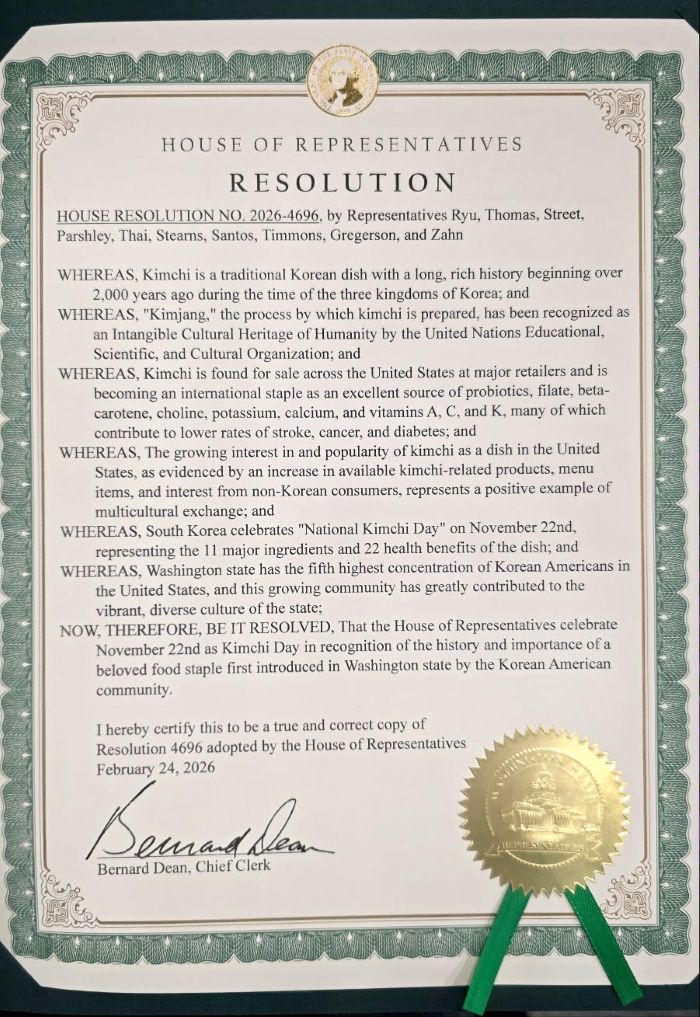 À̳¯ ÁÖ ÇÏ¿øÀº Ä£ÇÑÆÄ ÀÇ¿øµéÀ» Æ÷ÇÔÇÑ 10¸íÀÇ ÇÏ¿øÀÇ¿ø ¸íÀÇ·Î ¹ßÀÇµÈ °áÀǾÈ(House Resolution No. 2026-4696)À» ÅëÇØ 11¿ù 22ÀÏÀ» ¡®±èÄ¡ÀÇ ³¯¡¯·Î ±â³äÇϱâ·Î Çß´Ù. °áÀǾÈÀº Çà»ç ÀÚ¸®¿¡¼ ¼ÀºÁö ½Ã¾ÖƲÃÑ¿µ»ç¿¡°Ô °ø½Ä Àü´ÞµÆ´Ù.