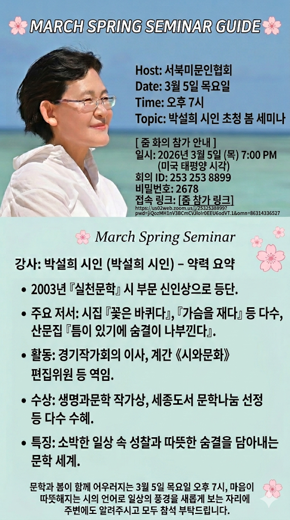 ¼ºÏ¹Ì¹®ÀÎÇùȸ(ȸÀå ±è¹Ì¼±, ÀÌ»çÀå ½É°©¼·)´Â ¿À´Â 3¿ù 5ÀÏ(¸ñ) ¿ÀÈÄ 7½Ã, ¹Ú¼³Èñ ½ÃÀÎÀ» ÃÊÃ»ÇØ ¿Â¶óÀÎ º½ ¼¼¹Ì³ª¸¦ °³ÃÖÇÑ´Ù.