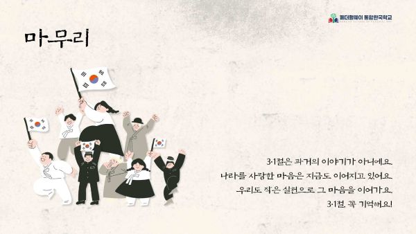 ÀÌÀçÀº ±³ÀåÀº 3¡¤1¿îµ¿ÀÇ ¹è°æ°ú Àǹ̸¦ ¼³¸íÇϸç ÀÚÀ¯¿Í ÆòÈÀÇ °¡Ä¡¸¦ °Á¶Çß°í, ÇлýµéÀº űر⸦ ¹è¿ì°í Á÷Á¢ ¡°´ëÇѵ¶¸³¸¸¼¼¡±¸¦ ¿ÜÄ¡¸ç ±³³» ÇàÁøÀ» ÁøÇàÇß´Ù.