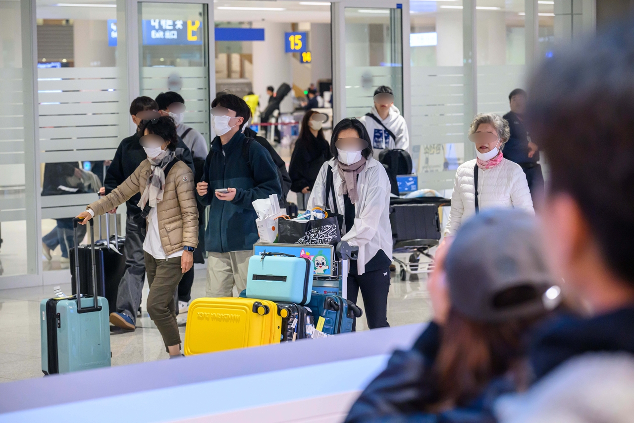 | Áßµ¿ »çÅ ¿©ÆÄ·Î µÎ¹ÙÀÌ ÇöÁö¿¡ ü·ùÇÏ´ø Çѱ¹ÀÎ °ü±¤°´ 79¸íÀÌ 5ÀÏ ¿ÀÈÄ ÀÎõ±¹Á¦°øÇ× Á¦2Å͹̳ÎÀ» ÅëÇØ ±Í±¹ÇÏ´Â °¡¿îµ¥ ¿©Çà°´µéÀÌ Ãâ±¹ÀåÀ» ³ª¼°í ÀÖ´Ù. ¿µÁ¾µµ=ÀÓ¼¼ÁØ ±âÀÚ |