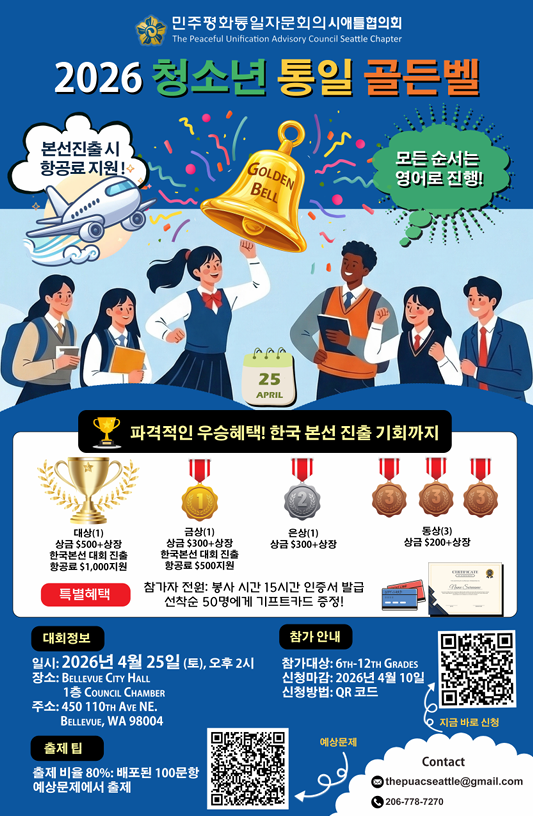 Âü°¡¸¦ ¿øÇÏ´Â ÇлýÀº 4¿ù 10ÀϱîÁö ¿Â¶óÀÎ ½Åû¼¸¦ ÅëÇØ Á¢¼öÇÒ ¼ö ÀÖÀ¸¸ç, ÀÚ¼¼ÇÑ ¹®ÀÇ´Â ÀüÈ(206-778-7270) ¶Ç´Â À̸ÞÀÏ(thepuacseattle@gmail.com)·Î °¡´ÉÇÏ´Ù.