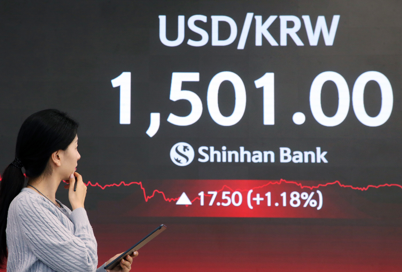 | 19ÀÏ ¼¿ï Áß±¸¿¡ À§Ä¡ÇÑ ½ÅÇÑÀºÇà µô¸µ·ë¿¡ 17³â ¸¸¿¡ ÃÖ°íÄ¡¸¦ ÂïÀº ¿ø¡¤´Þ·¯ ȯÀ²ÀÌ Ç¥½ÃµÅ ÀÖ´Ù. /Á¦°ø=½ÅÇÑÀºÇà |