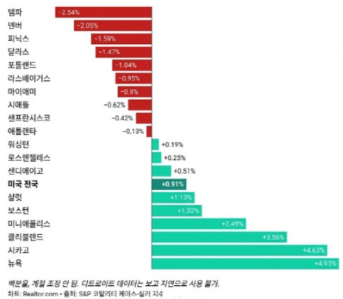 ÇØ´ç Áö¼ö¸¦ »êÃâÇÏ´Â ÁÖ¿ä 25°³ µµ½Ãº°·Î´Â ±Ø¸íÇÑ Â÷À̸¦ º¸¿´´Ù. ¸Å¹° ºÎÁ· Çö»óÀÌ Áö¼ÓµÇ°í ÀÖ´Â ºÏµ¿ºÎ¿Í Áß¼ºÎ ´ëµµ½ÃµéÀº ¿©ÀüÈ÷ °¼¼¸¦ À¯ÁöÇß´Ù. ´º¿åÀÌ ¿¬°£ 4.93% »ó½ÂÇϸç Á¶»ç ´ë»ó µµ½Ã Áß 1À§¸¦ ±â·ÏÇßÀ¸¸ç, ½ÃÄ«°í(+4.63%)¿Í Ŭ¸®ºí·£µå(+3.56%)°¡ ±× µÚ¸¦ À̾ú´Ù.