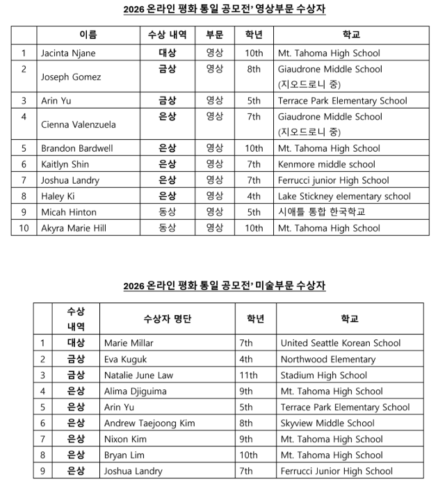 ¿ÃÇØ û¼Ò³â ÆòÈ ÅëÀÏ ¿Â¶óÀÎ °ø¸ðÀü ¼ö»óÀÚ ¸í´ÜÀº ´ÙÀ½°ú °°´Ù.