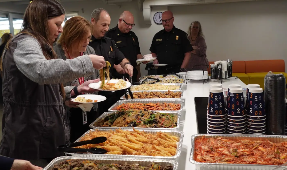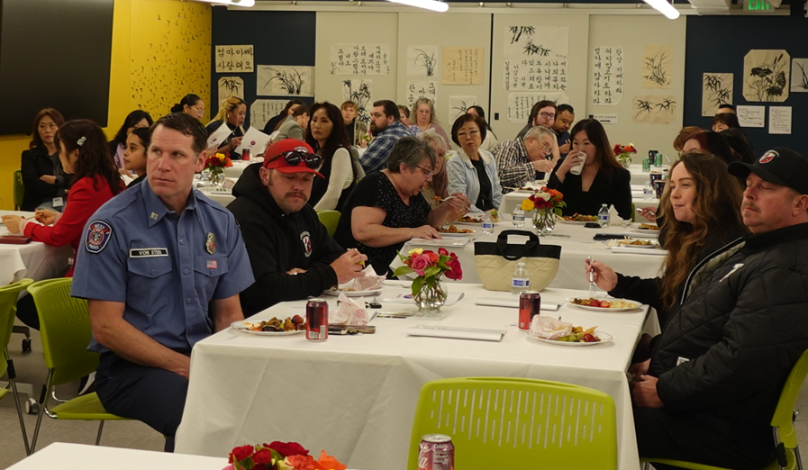 Á¡½É ½Ä»ç·Î´Â ºÒ°í±â, ´ßÆ¢±è, ¿À¡¾îººÀ½, ±è¹ä, ±èÄ¡ µî Çѱ¹ ÀüÅë À½½ÄÀÌ ¸¶·ÃµÆÀ¸¸ç, ¹Ì±¹ÀÎ Âü¼®ÀÚµéÀÇ ÀÔ¸ÀÀ» °í·ÁÇØ »÷µåÀ§Ä¡µµ ÇÔ²² ÁغñµÆ´Ù. ƯÈ÷ ´çÀÏ ¾÷¹«·Î Âü¼®ÇÏÁö ¸øÇÑ ¼Ò¹æ°üµéÀ» À§ÇØ Á¤¼º²¯ Æ÷Àå À½½ÄÀ» µû·Î ÁغñÇØ Àü´ÞÇÏ¸é¼ Å« È£ÀÀÀ» ¾ò¾ú´Ù.