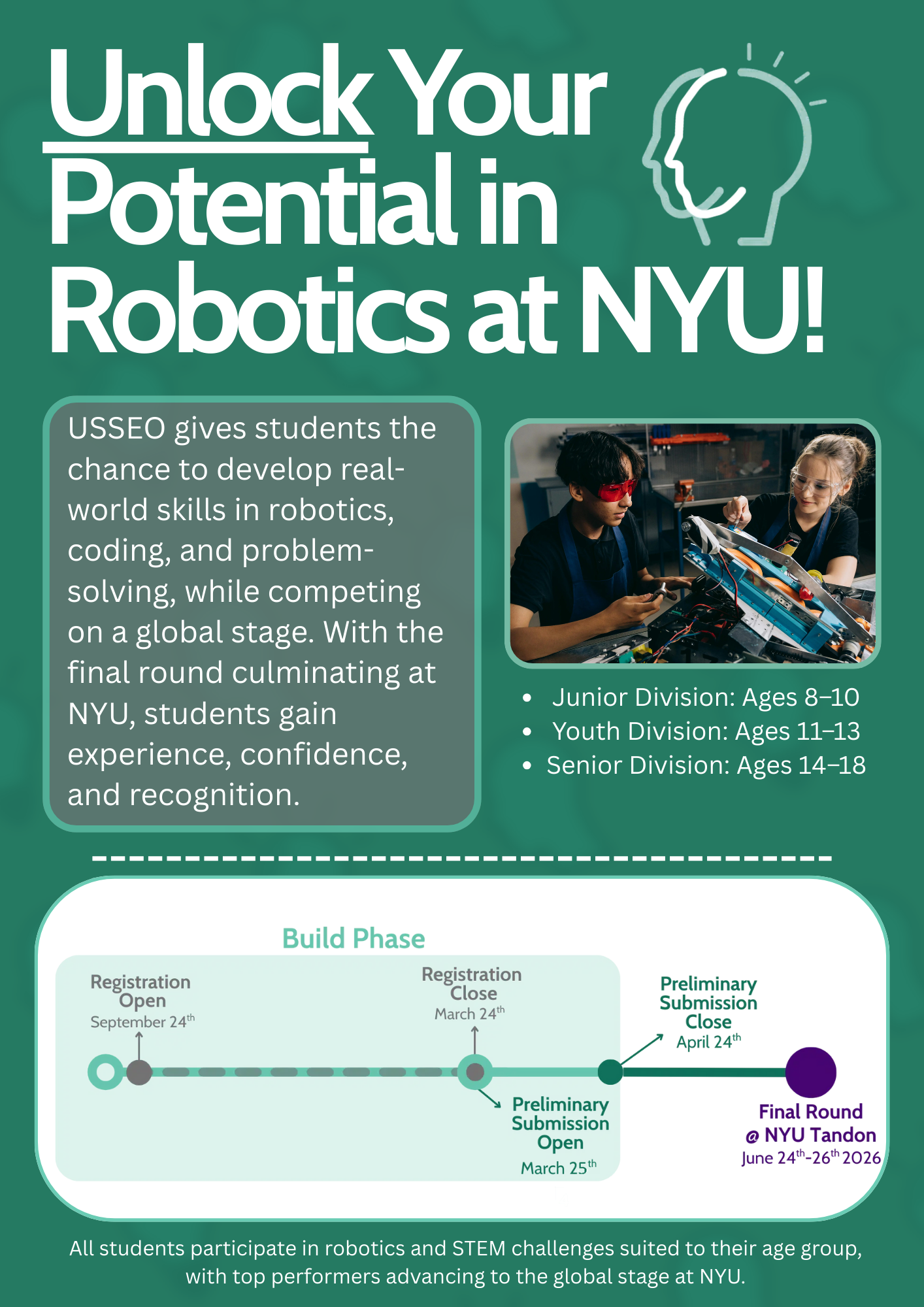 Âü°¡ ¹æ¹ý:¡Ü ´ëȸ¿¡ ´ëÇÑ »ó¼¼ Á¤º¸¿Í µî·ÏÀº ÀÏÁ¤: ¡Ü µî·Ï ±â°£: 2025³â 9¿ù 24ÀÏ – 2026³â 3¿ù 24ÀÏ ÁÖ¿ä Á¤º¸:¡Ü º»¼± Âü°¡ÆÀÀº NYU Tandon Ä·ÆÛ½º¿¡¼ °æÀïÇÒ ±âȸ¸¦ °¡Áö¸ç, ¹«·á Åõ¾î¿Í ¾×ƼºñƼ°¡ Á¦°øµË´Ï´Ù. USSEO¿¡¼ ¿©·¯ºÐÀÇ ·Îº¿°øÇÐ ½Ç·ÂÀ» º¸¿©ÁÖ¼¼¿ä! Join USSEO @ NYU TANDON! The USSEO Robotics Challenge at NYU Tandon introduces student innovators to the impact of engineering, creativity, robotics, and AI in solving real-world challenges. Students design, build, and test a single robot based on the year¡¯s theme, gaining hands-on experience in mechanical design, teamwork, and structured problem-solving. Schools may register multiple teams, though each student may join only one team and each team may submit one robot. The challenge includes a virtual preliminary round and an in-person final at the NYU Tandon School of Engineering, where top teams present their robots, compete for awards, and receive recognition for their work. Age Groups: How to Participate: ¡Ü Detailed information and registration for the competition can be found at ¡Ü Materials for the challenges can be accessed at https://www.usseo.org/challenges Schedule: ¡Ü Registration: September 24, 2025 - March 24, 2026 ¡Ü Preliminary Submission Window: March 25, 2026 - April 24, 2024 ¡Ü Final Round: June 24, 2026 - June 26, 2026 Key Information: ¡Ü Finalists will have the opportunity to compete at the NYU Tandon campus, with free tours and activities provided. ¡Ü prizes and certificates will be awarded to the winners and high performers. ¡Ü Opportunities for mentoring by experts in robotics and related fields will be available, along with the chance for cultural exchange with students worldwide. Showcase your Robotics abilities at USSEO! #USSEO #RoboticsOlympiad #InternationalCompetition