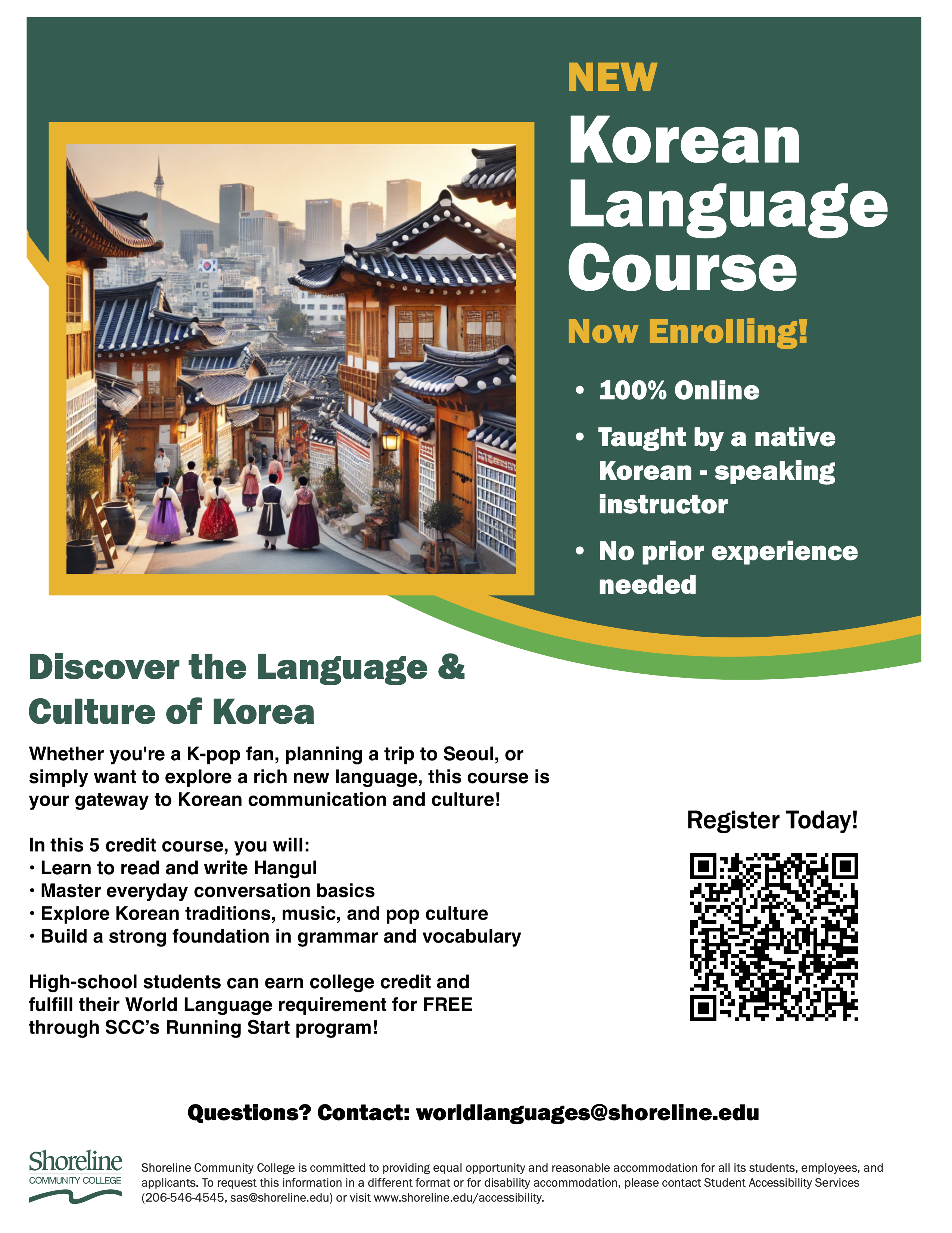 ¾È³çÇϼ¼¿ä, ½Ã¾ÖƲ Áö¿ª Çкθð´Ô ±×¸®°í ¹è¿òÀ» »ç¶ûÇÏ´Â ¼ºÀÎ ÇнÀÀÚ ¿©·¯ºÐ!´Ù°¡¿À´Â º½ Çбâ(4¿ù 1ÀÏ ½ÃÀÛ), **¼î¾î¶óÀÎ Ä¿¹Â´ÏƼ Ä®¸®Áö(Shoreline Community College)**¿¡¼ ¿¸®´Â ¿Â¶óÀÎ Çѱ¹¾î Á¤±Ô °úÁ¤(Korean 121, 122) µî·Ï ¼Ò½ÄÀ» °øÀ¯ÇØ µå¸³´Ï´Ù.´Ü¼øÇÑ Ãë¹Ì ÇнÀ »Ó¸¸ ¾Æ´Ï¶ó, **Á¤½Ä ´ëÇÐ ÇÐÁ¡(College Credit)**ÀÌ ºÎ¿©µÇ´Â °úÁ¤À¸·Î °íµîÇлý ÀÚ³àÀÇ ´ëÀÔ Áغñ¿Í ¼ºÀκеéÀÇ ÀÚ±â°è¹ß¿¡ ÃÖ°íÀÇ ±âȸ°¡ µÉ °ÍÀÔ´Ï´Ù.✨ ÀÌ·± ºÐµé²² °·ÂÈ÷ ÃßõÇÕ´Ï´Ù!🎓 ´ëÇÐ ÀԽø¦ ÁغñÇÏ´Â °íµîÇлý: 4³âÁ¦ ´ëÇÐ ÀÔ½ÃÀÇ Çʼö Á¶°ÇÀÎ '¿Ü±¹¾î 2³â À̼ö'¸¦ ¿Ïº®È÷ ÃæÁ·ÇÕ´Ï´Ù. ƯÈ÷ Çѱ¹¾î´Â AP ½ÃÇèÀÌ ¾ø±â ¶§¹®¿¡, ´ëÇÐ ·¹º§ÀÇ ¼ö¾÷À» ¼ö°Çß´Ù´Â ±â·ÏÀº ÀԽà »çÁ¤°üµé¿¡°Ô ÇлýÀÇ **Çо÷Àû µµÀü Á¤½Å(Academic Rigor)**À» º¸¿©ÁÙ ¼ö ÀÖ´Â °¡Àå È®½ÇÇÑ ¹æ¹ýÀÔ´Ï´Ù.🏡 Ȩ½ºÄð¸µ: ¼öÁØ ³ôÀº ¿Â¶óÀÎ ÇнÀÀ» ã°í °è½Å°¡¿ä? Çб³¿¡ Á÷Á¢ °¥ ÇÊ¿ä ¾øÀÌ Á¤±Ô ´ëÇÐ Ä¿¸®Å§·³À» Áý¿¡¼ Æí¾ÈÇÏ°Ô À̼öÇÒ ¼ö ÀÖ½À´Ï´Ù.💻 ¹Ù»Û Á÷ÀåÀÎ ¹× ¼ºÀÎ ÇнÀÀÚ: 100% ¿Â¶óÀÎ ºñ½Ç½Ã°£(Asynchronous) ¼ö¾÷À¸·Î ÁøÇàµË´Ï´Ù. Á¤ÇØÁø ¼ö¾÷ ½Ã°£ ¾øÀÌ º»ÀÎÀÇ ½ºÄÉÁÙ¿¡ ¸ÂÃç Àü±¹ ¾îµð¼³ª À¯¿¬ÇÏ°Ô ÇнÀÇÒ ¼ö ÀÖ½À´Ï´Ù.💰 Çкñ Àý¾àÀ» ¿øÇÏ´Â ¿ö½ÌÅÏÁÖ Çлý: ·¯´× ½ºÅ¸Æ®(Running Start) ÇÁ·Î±×·¥À» ÀÌ¿ëÇÏ¸é °ú¸ñ´ç 5ÇÐÁ¡ÀÇ ´ëÇÐ ¼ö¾÷À» ¹«·á·Î ¼ö°ÇÒ ¼ö ÀÖ¾î ´ëÇÐ Çкñ¸¦ ȹ±âÀûÀ¸·Î Àý¾àÇÒ ¼ö ÀÖ½À´Ï´Ù.