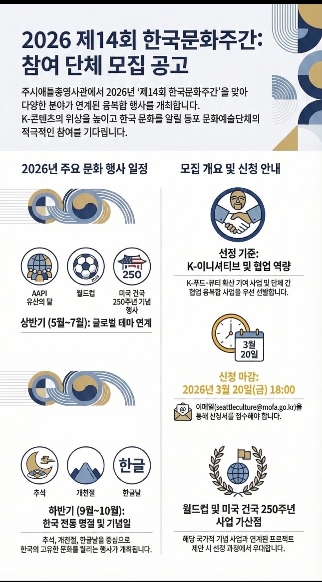 Âü¿©¸¦ Èñ¸ÁÇÏ´Â ´Üü´Â ½Åû¼¸¦ ÀÛ¼ºÇØ 3¿ù 20ÀÏ(±Ý) ¿ÀÈÄ 6½Ã±îÁö À̸ÞÀÏ(seattleculture@mofa.go.kr)·Î Á¦ÃâÇÏ¸é µÈ´Ù. ¼±Á¤ °á°ú´Â ½É»ç ÈÄ °¢ ´Üü¿¡ °³º° Å뺸µÈ´Ù.